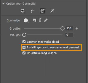 - Schakel het selectievakje Instellingen synchroniseren met penseel in voor het gummetje (E).