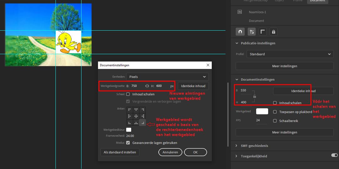 In het volgende voorbeeld wordt een werkgebied van 550 x 400 proportioneel geschaald naar 750 x 600 vanaf het ankerpunt rechtsonder op het werkgebied: