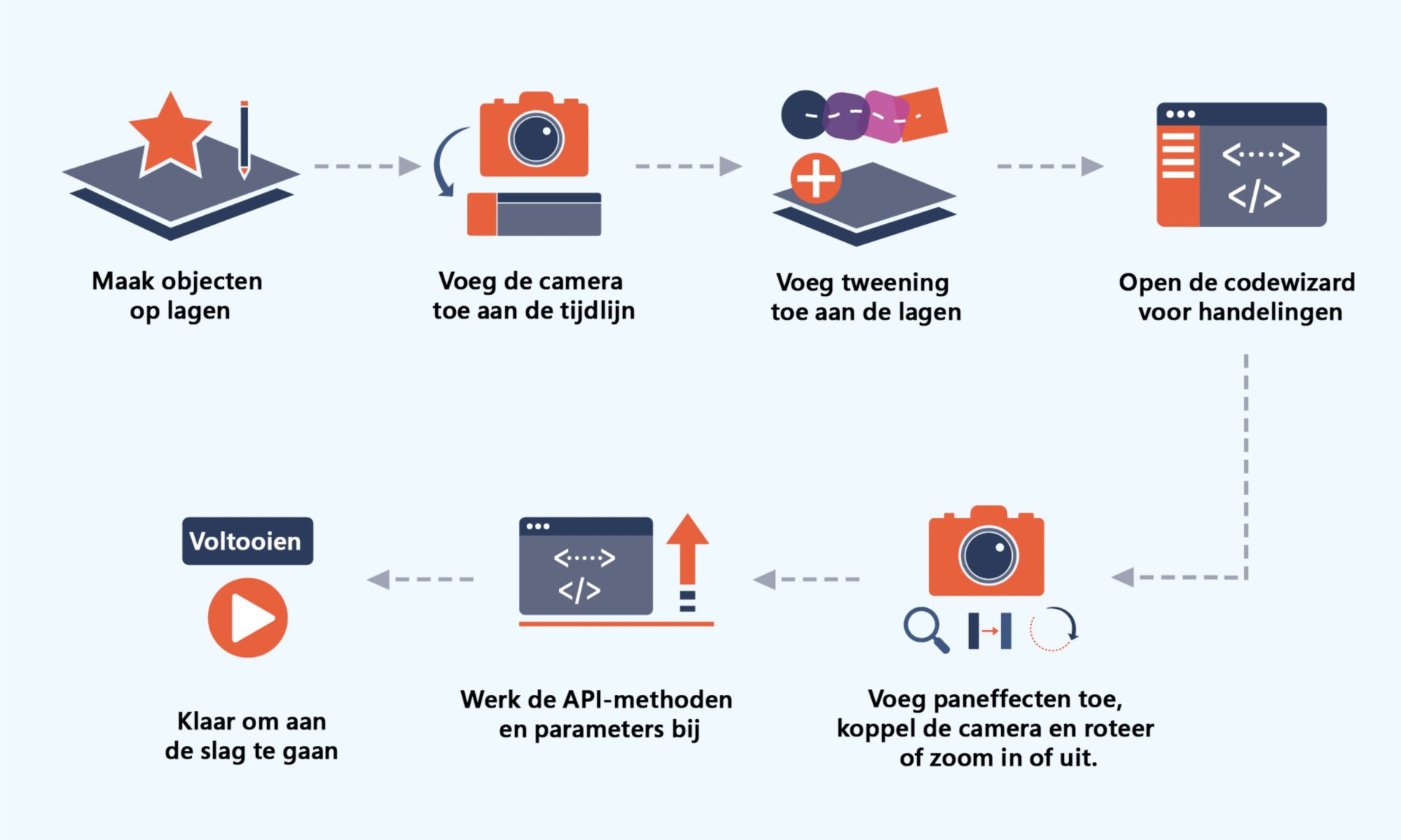 Het volgende stroomdiagram toont een stapsgewijze aanpak voor het maken van animaties met een interactieve camera. U kunt de codewizard voor handelingen gebruiken in een HTML Canvas-document.