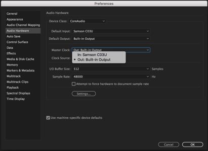 Stappen: klik op de knop Audiohardware of open Voorkeuren > Audiohardware en klik om de Hoofdklok te wijzigen.Wanneer een apparaat wordt losgekoppeld, of als er meer dan één apparaat met een incompatibele instellingen actief is, kan dit een communicatiefout veroorzaken waardoor Audition geen audio kan afspelen of opnemen.