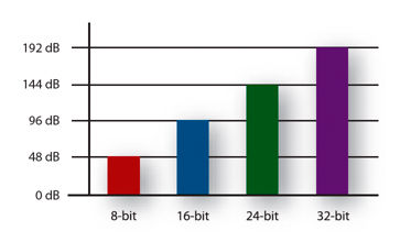 Bit depth determines dynamic range. When a sound wave is sampled, each sample is assigned the amplitude value closest to the original wave’s amplitude. Higher bit depth provides more possible amplitude values, producing greater dynamic range, a lower noise floor, and higher fidelity.