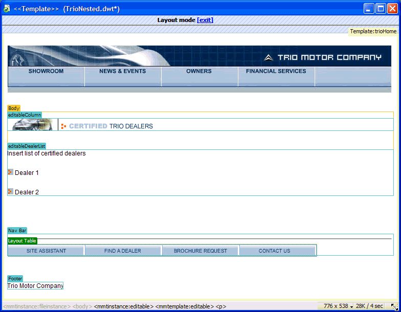 In het volgende voorbeeld bevat de sjabloon trioHome drie bewerkbare gebieden, namelijk Body, Nav, Bar en Footer: