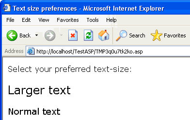 Wanneer de gebruiker op de hypertextkoppeling klikt, verzendt de pagina de tekstvoorkeur van de gebruiker in een URL-parameter naar de doelpagina. De code op de doelpagina slaat de URL-parameter op in de sessievariabele font_pref. Voor de duur van de sessie van de gebruiker halen alle pagina's van de toepassing deze waarde op en geven ze de geselecteerde tekengrootte weer.