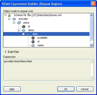 U kunt een knooppunt selecteren om te herhalen en de resultaten eventueel filteren. In het dialoogvenster XPath Expression Builder wordt de geselecteerde inhoud omsloten binnen een <xsl:for-each>-blok. Als u geen inhoud hebt geselecteerd, wordt het <xsl:for-each>-blok ingevoerd op de plaats van de invoegpositie.