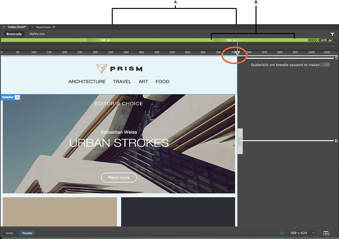 Als u uw pagina wilt bekijken in een bepaald formaat (onderbrekingspunt), klikt u op de overeenkomende mediaquerybalk. Het document wordt uitgelijnd op het onderbrekingspunt.