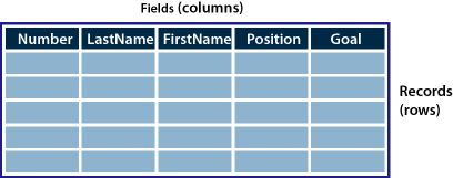 Een verzameling gegevens die in tabellen zijn opgeslagen. Elke rij van een tabel bestaat uit één record en elke kolom bestaat uit een veld in de record, zoals u in het volgende voorbeeld kunt zien.