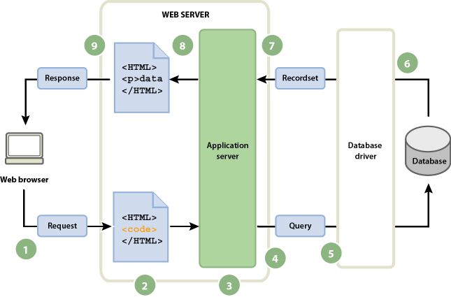 A. De webbrowser vraagt een dynamische pagina op. B. De webserver zoekt de pagina en geeft deze door aan de toepassingsserver. C. De toepassingsserver scant de pagina op instructies. D. De toepassingsserver verzendt de query naar het databasestuurprogramma. E. Het stuurprogramma voert de query uit op de database. F. De recordset wordt als resultaat geretourneerd aan het stuurprogramma. G. Het stuurprogramma geeft de recordset door aan de toepassingsserver. H. De toepassingsserver voegt de gegevens in op de pagina en geeft de pagina door aan de webserver. I. De webserver verzendt de voltooide pagina naar de betreffende browser.