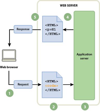 De toepassingsserver leest de code op de pagina, verwerkt de pagina volgens de instructies in de code en verwijdert de code vervolgens van de pagina. Het resultaat is een statische pagina die de toepassingsserver weer teruggeeft aan de webserver, die de pagina op zijn beurt verzendt naar de browser die de pagina heeft opgevraagd. Als de pagina arriveert, ontvangt de browser alleen HTML. Hier volgt een weergave van het proces: