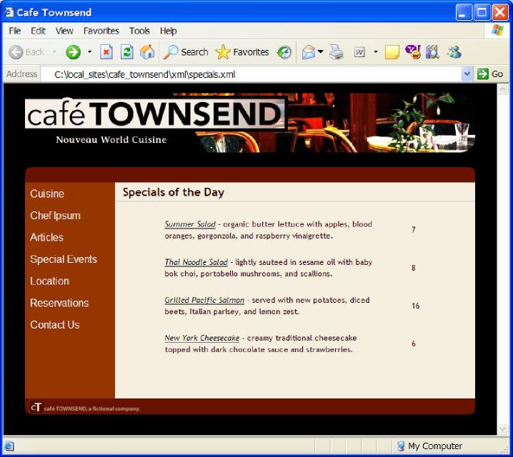 Als u niet de eigenaar bent van de XML-pagina waarnaar u koppelt (bijvoorbeeld als u XML-gegevens uit een RSS-feed ergens op het web wilt gebruiken), is de workflow iets gecompliceerder. Voor het uitvoeren van client-side transformaties met XML-gegevens van een externe bron moet u eerst het XML-bronbestand downloaden naar de directory waarin uw XSLT-pagina zich bevindt. Als de XML-pagina op uw lokale site aanwezig is, kunt u met Dreamweaver de juiste code toevoegen die de XML-pagina aan de XSLT-pagina koppelt en beide pagina's (het gedownloade XML-bestand en de gekoppelde XSLT-pagina) naar uw webserver posten. Als de gebruiker in een browser de XML-pagina bekijkt, wordt de inhoud door de XSLT-pagina opgemaakt, net als in het vorige voorbeeld.