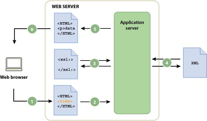 A. De browser vraagt een dynamische pagina aan B. De webserver zoekt de pagina en geeft deze door aan de toepassingsserver C. De toepassingsserver scant de pagina op instructies en haalt het XSLT-fragment op D. De toepassingsserver voert de transformatie uit (leest het XSLT-fragment, haalt XML-gegevens op en maakt deze op) E. De toepassingsserver voegt het getransformeerde fragment op de pagina in en geeft deze terug aan de webserver F. De webserver verzendt de voltooide pagina naar de browser