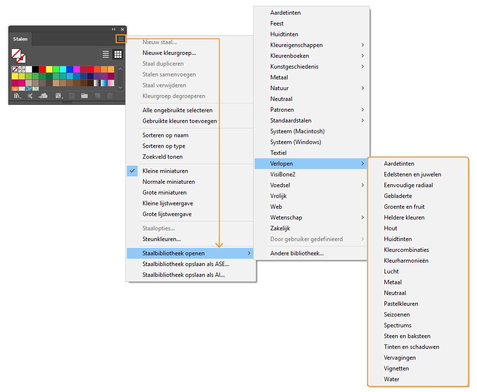 - Open het deelvenster Stalen door te klikken op Venster > Stalen. Klik op de objectvulling in het deelvenster Stalen. De geselecteerde kleur wordt op de geselecteerde kleurstop toegepast.