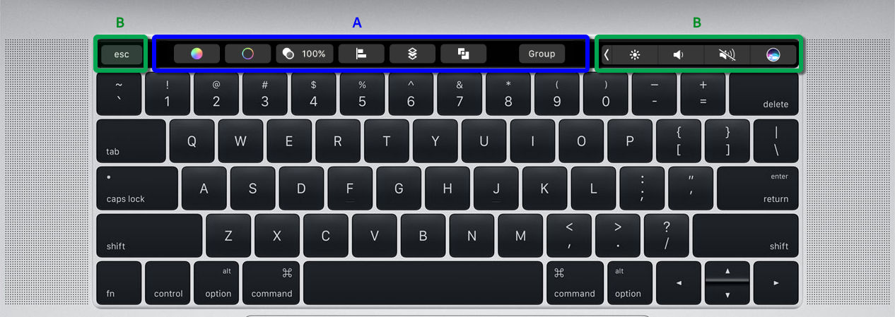 Standaard wordt een deel van de Touch Bar-interface gereserveerd voor macOS-opties. De opties voor Illustrator worden weergegeven in het app-specifieke gedeelte in het midden van de Touch Bar.