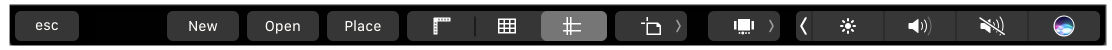 - Als er geen object is geselecteerd in de Illustrator-werkruimte, bevat de Touch Bar opties om een document te maken of te openen, een bestand te plaatsen, linialen, rasters en hulplijnen te tonen of te verbergen en met tekengebieden te werken.
