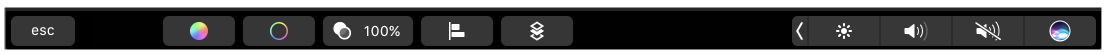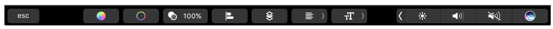Illustrator biedt ondersteuning voor de Touch Bar, de aanraakbalk boven aan het toetsenbord van de nieuwe MacBook Pro. Met de Touch Bar hebt u toegang tot Illustrator-functies en -opties in de context van de huidige taak op het hoofdscherm. De Touch Bar ondersteunt vertrouwde bewegingen, zoals tikken, slepen en vegen.