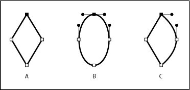 Een hoekpunt kan twee, één of geen richtingslijnen hebben, afhankelijk van het feit of het respectievelijk met twee, één of geen gebogen segmenten is verbonden. Met de richtingslijnen van een hoekpunt blijft de hoek behouden door verschillende hoeken te gebruiken. Wanneer u echter een richtingslijn op een hoekpunt zet, wordt alleen de curve aangepast aan de kant van het punt waar die richtingslijn zich bevindt.
