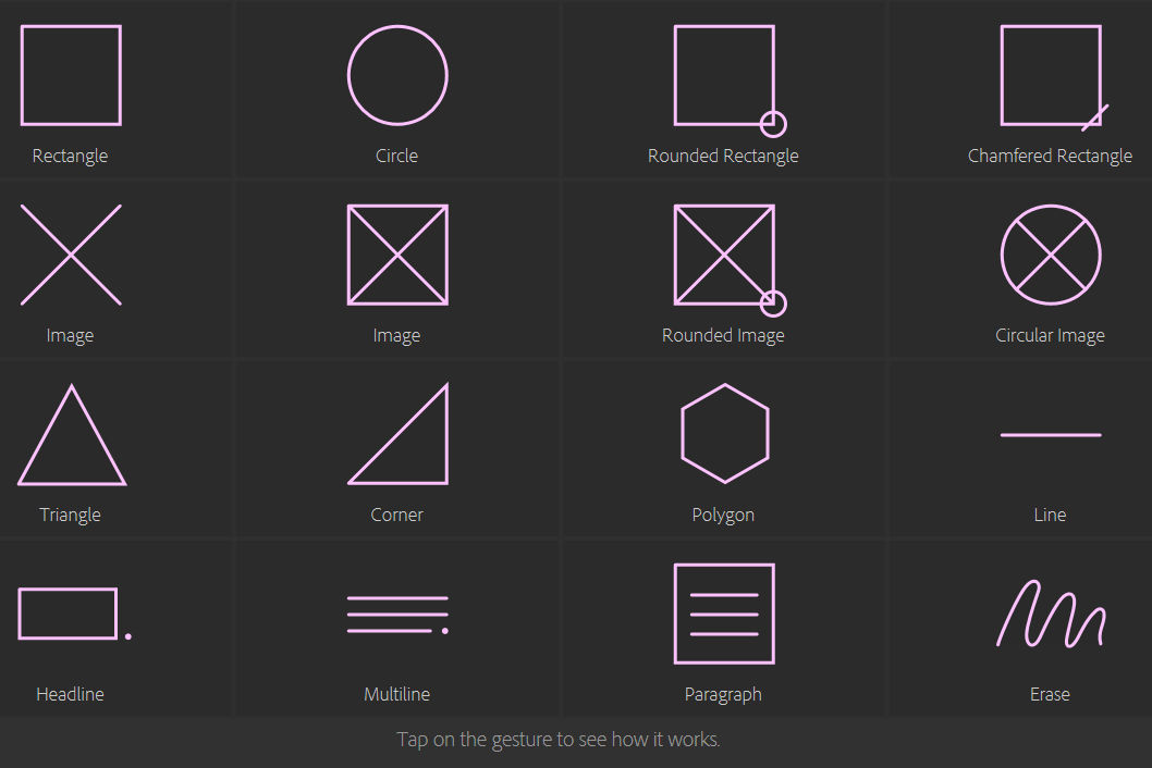 Gebruik een van de 16 gebaren om InDesign-elementen voor uw layout te maken. Zie de volgende afbeelding voor gebaren die u kunt gebruiken: