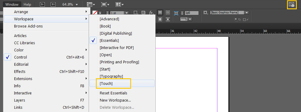 Als u wilt overschakelen naar de werkruimte voor aanraken, gaat u naar Venster > Werkruimte > Aanraken of tikt u op het pictogram van de werkruimte voor aanraken in de rechterbovenhoek van de InDesign-werkruimte waarin u op dat moment werkt.