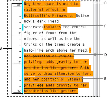 A. Wijzigingsbalken B. Toegevoegde tekst C. Verwijderde tekst D. Verplaatste tekst (van) E. Verplaatste tekst (naar)