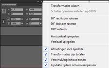 Het deelvenster Transformeren bevat meerdere opties die bepalen hoe objecten worden getransformeerd en hoe transformaties worden weergegeven in het regelpaneel en in het deelvenster Transformeren.