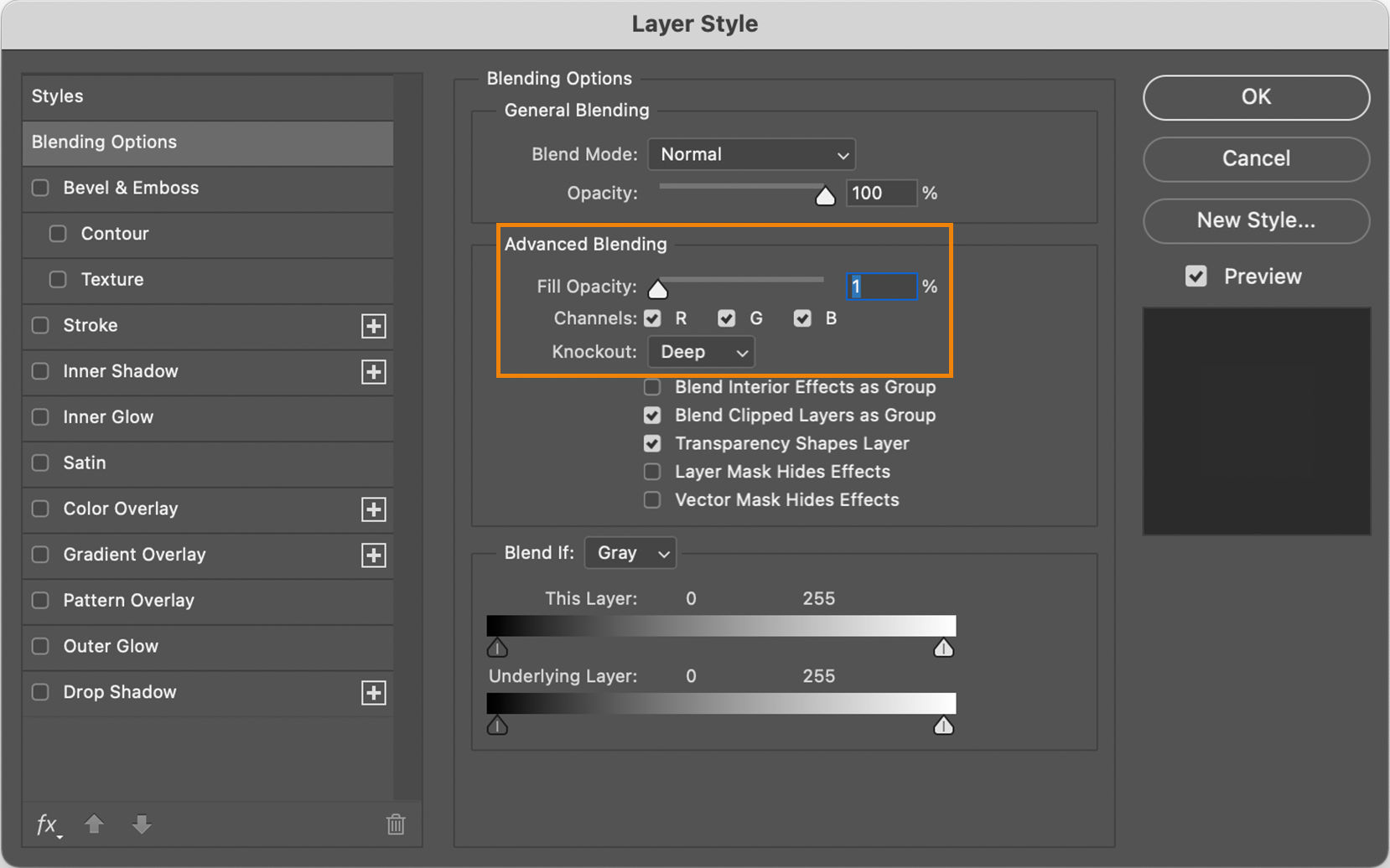 Opmerking:Als u geen laaggroep of uitknipmasker gebruikt, maakt u met zowel Diep als Ondiep een uitname die de achtergrondlaag zichtbaar maakt (of transparantie als de onderste laag geen achtergrondlaag is).