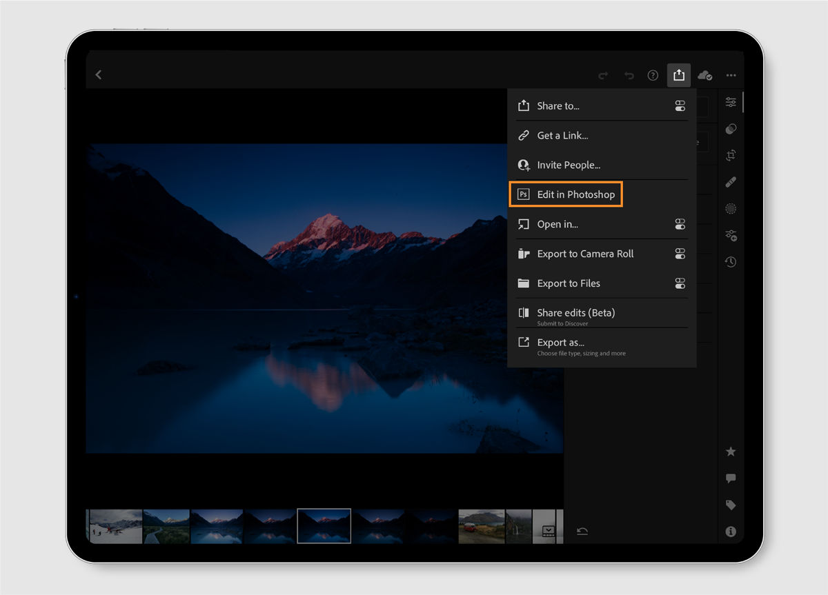 Selecteer Bewerken in Photoshop in het exportmenu dat wordt geopend. Uw foto wordt nu geopend in Photoshop op uw iPad, waar u deze kunt bewerken. Alle tools uit Photoshop op de iPad zijn beschikbaar in de Lightroom naar Photoshop-werkruimte Bewerken.