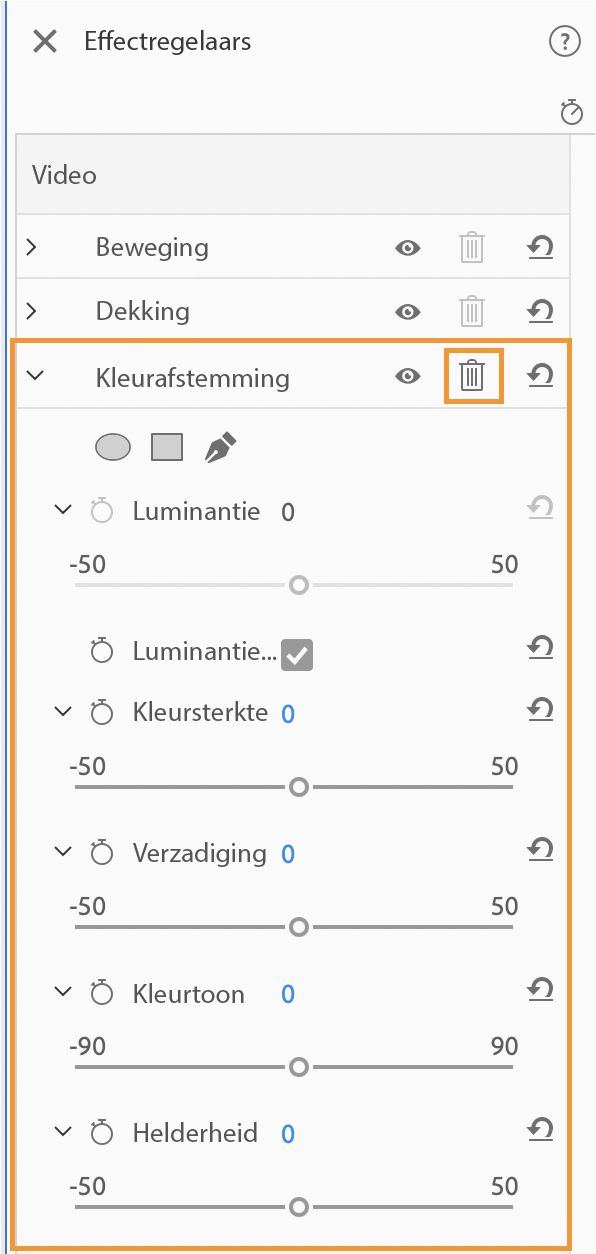 In het deelvenster Toegepaste effecten kunt u de luminantie, kleursterkte, verzadiging, kleurtoon en helderheid van uw video verder verfijnen met behulp van intensiteitsschuifregelaars. Selecteer het pictogram Effect verwijderen om het effect Kleurafstemming te verwijderen.