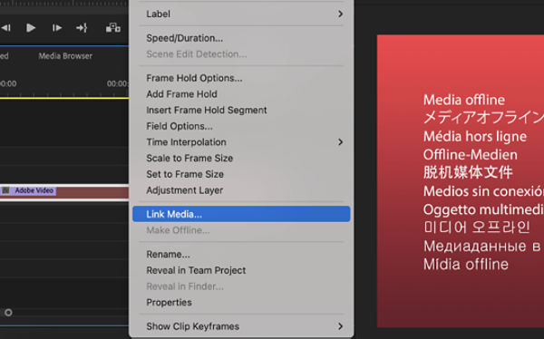 If you ever experience missing media, you can use the same relink workflow (Link Media) in Team Projects as you do in the Premiere Pro project. This workflow is a local-only change and isn't treated as an edit to the project, thus eliminating the need to share it with other collaborators.