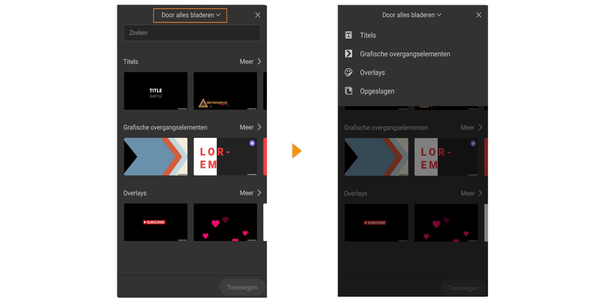 U kunt ook naar specifieke elementen zoeken, zoals titels, overgangsafbeeldingen en dergelijke. Tik hiervoor op de keuzelijstknop bij Alles doorbladeren. U kunt een element opslaan en dit later openen vanuit de optie Opgeslagen.