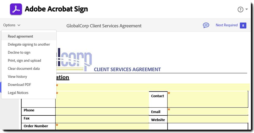 Voor de Acrobat Sign Solutions-serviceniveaus is een nieuwe ondertekeningservaring in zowel desktopinterfaces als mobiele interfaces (beide worden ingeschakeld via hetzelfde configuratiescherm voor beheerders) beschikbaar waarin de velden van de ontvanger en het ondertekeningsproces beter worden gemarkeerd, wat de algemene ondertekenaarservaring en het voltooiingspercentage verbetert.