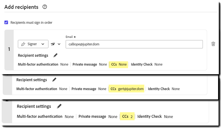 - Houd er rekening mee dat de ontvanger die in CC is geplaatst, slechts aan één individuele ontvanger is gekoppeld. Als één persoon is geconfigureerd om meerdere keren met de overeenkomst te werken (met behulp van meerdere ontvangersrecords), moet elke ontvangersrecord voor die persoon worden geconfigureerd (of niet, naar wens). Acrobat Sign gaat er niet vanuit dat als hetzelfde e-mailadres in meerdere ontvangersrecords wordt gebruikt, dezelfde CC-meldingsregels op alle records van toepassing zijn.