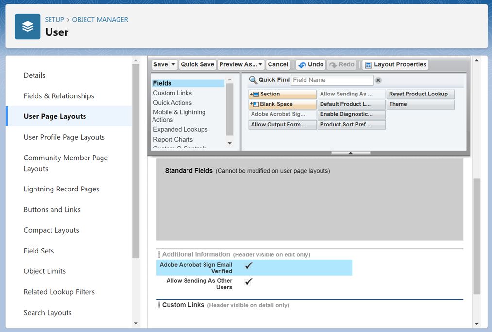 Als u de functie 'Verzenden namens' wilt inschakelen, moet u de machtigingenset 'Adobe Acrobat Sign-beheerder' instellen op Salesforce-beheerders. Het geeft beheerders toegang tot de volgende twee velden die nodig zijn om de functie 'Verzenden namens' in te schakelen: