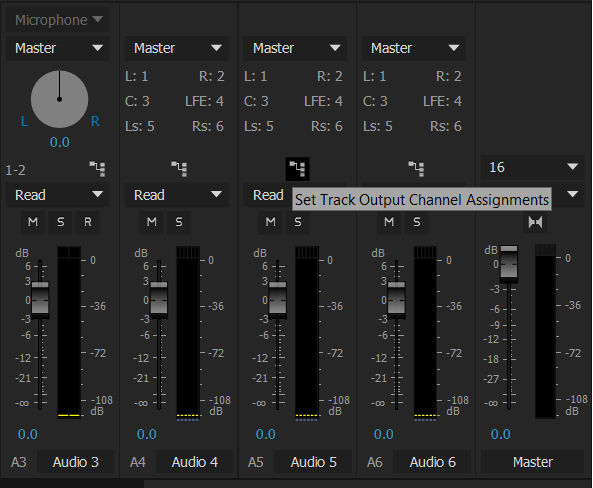 • When the output track contains fewer channels than in the other audio tracks, Premiere Pro downmixes the audio to the number of channels in the output track.