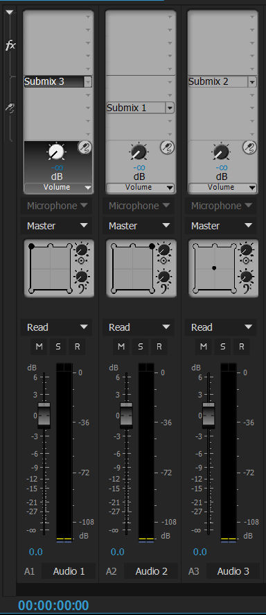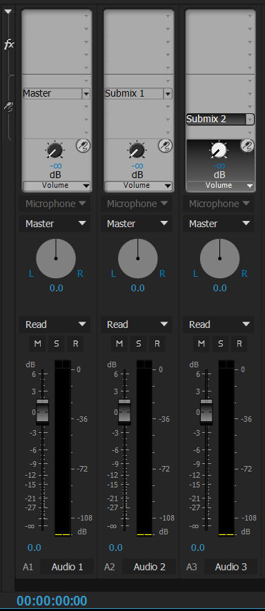 While the master audio track is the default output track, a sequence can also include submix tracks. Submix tracks can be both an output destination of other audio tracks and an audio source to the master track (or other submix tracks). Therefore, the number of channels in a submix track affects the pan or balance controls available in tracks that output to it, and the number of channels in the submix output track affect whether panning or balancing is available for that submix track.