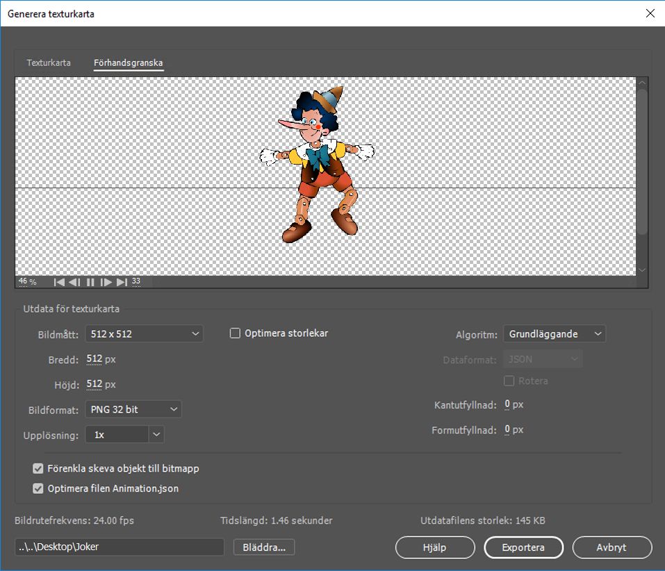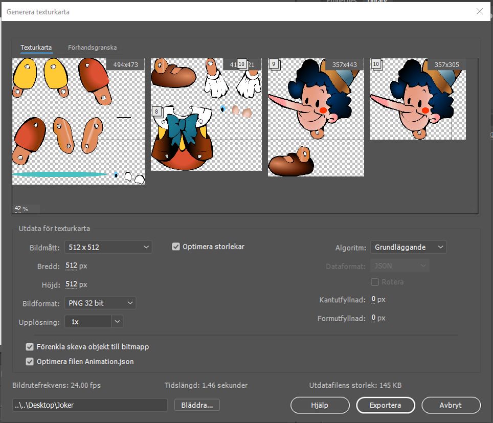 Bildformat Den exporterade sprite-mallens filformat. 8-bitars PNG och 32-bitars PNG har stöd för genomskinlig bakgrund (alfakanal). Den visuella skillnaden mellan 8-bitars PNG och 32-bitars PNG är i allmänhet mycket liten. 32-bitars PNG-filer är fyra gånger större än 8-bitars PNG-filer. Upplösning Markera ett värde mellan 0,3 och 3,0 Kantutfyllnad Utfyllnaden runt texturkartans kanter i pixlar Formutfyllnad Utfyllnaden mellan varje bild i texturkartan i pixlar. Algoritm Den teknik som används för att paketera bilderna i texturkartan. Det finns två alternativ: