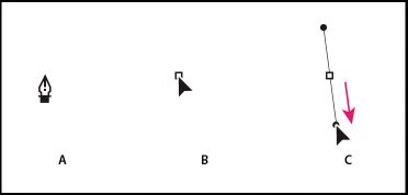 Rita den första punkten i en kurva A. Placera ritstiftsverktyget B. Börja dra (musknappen nedtryckt) C. Dra för att utöka riktningslinjer.