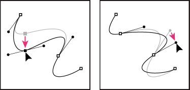 Om du vill konvertera en hörnpunkt till en utjämnad punkt använder du verktyget Delmarkering för att markera punkten och placerar sedan tangenthandtagen genom att hålla ned Alt (Windows) eller Option (Macintosh) samtidigt som du drar punkten.