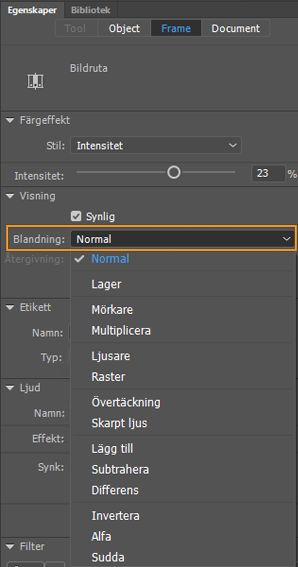 Om du vill använda blandningslägen på en viss bildruta måste du först välja bildruta och sedan ett blandningsläge i avsnittet Visa på bildrutepanelen.