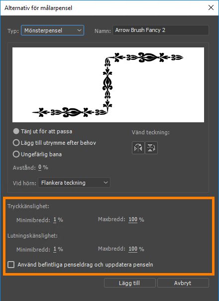 Klicka på Lägg till för att lägga till en ny pensel med de valda inställningarna för tryck- och lutningskänslighet.