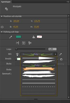 Dubbelklicka på en mönsterpensel i penselbiblioteket som du vill lägga till i dokumentet. När du har lagt till den i dokumentet, visas den i listrutan Linjestil på egenskapspanelen.