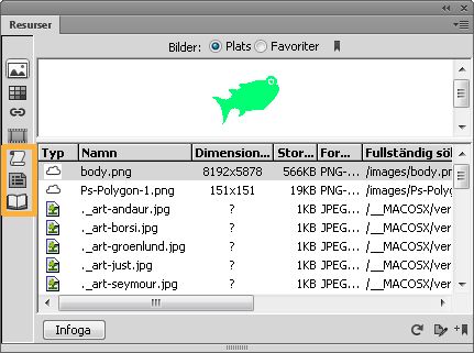 För att en fil ska visas i resurspanelen måste den passa i någon av dessa kategorier. En del andra typer av filer kallas ibland resurser, men de visas inte i panelen.