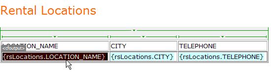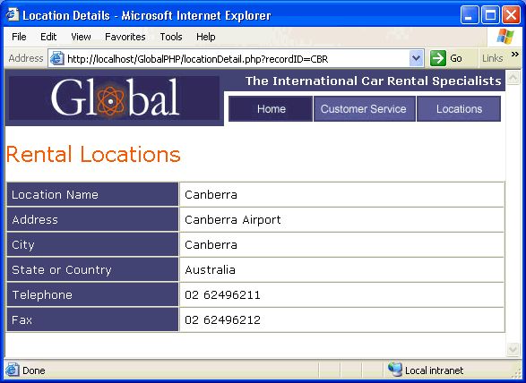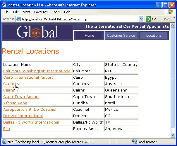 När sidan körs, infogas värdena i postmängdens CODE-fält i motsvarande rader i den dynamiska tabellen. Om till exempel platsen Canberra, Australia, rental har koden CBR, används följande URL i Canberra-raden i den dynamiska tabellen: