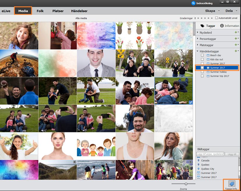 Ofta vill du gruppera foton eller videofiler enligt den händelse de är associerade med, till exempel ett bröllop eller en födelsedag. Med Elements Organizer får du två sätt att ordna dina mediefiler efter händelser: