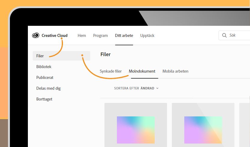 - assets.adobe.com (webben): Gå till Creative Cloud > Filer > Ditt arbete > Molndokument.