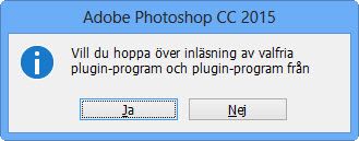 Håll ned Skift och starta Photoshop. En dialogruta visas under start där det står ”Skip loading optional and third-party plug-ins?” (Hoppa över inläsning av valfria plugin-program eller plugin-program från tredje part?)
