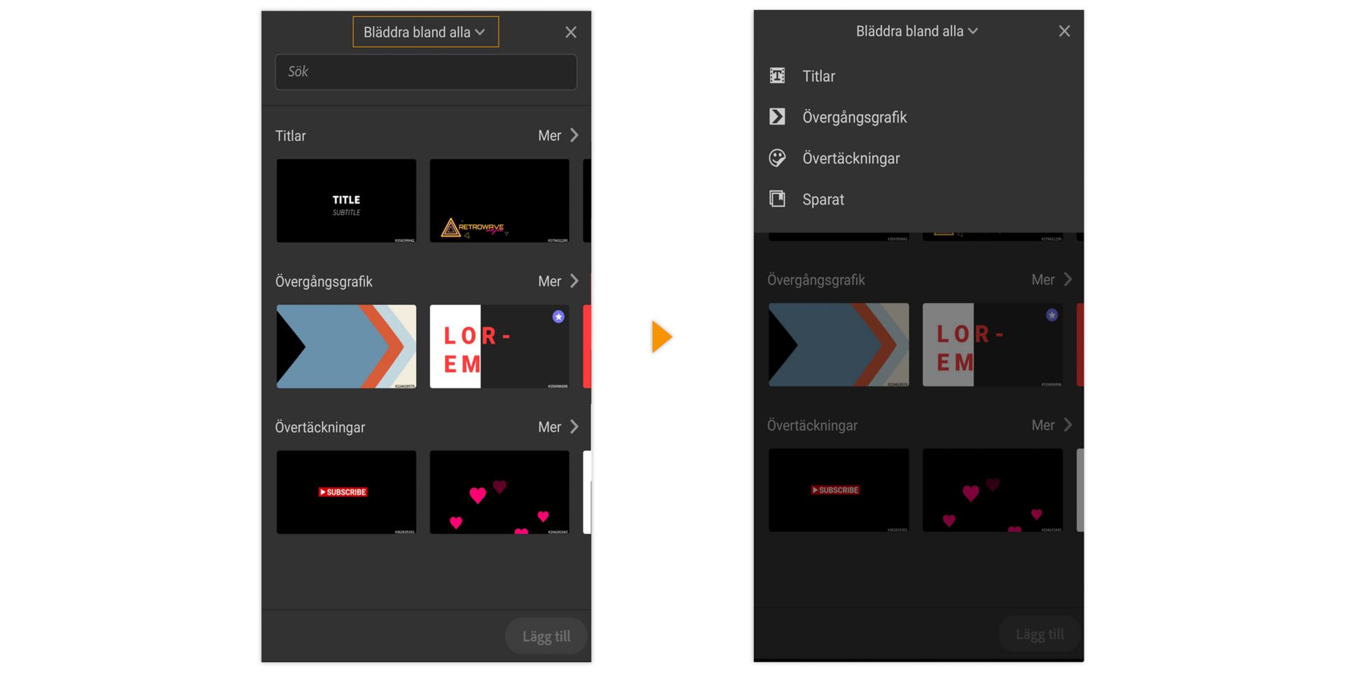 Du kan snabbt söka efter inbyggda ljud i Premiere Rush med hjälp av nyckelord. Resultaten inkluderar matchande titlar, artister, genrer och kategorier.