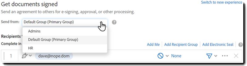 - Lägg till mottagargrupp – Klicka på den här länken när du vill skapa en grupp mottagare där en behöver delta för hela gruppen. Skapa till exempel en grupp för HR-teamet, där endast en person från HR faktiskt måste signera avtalet.