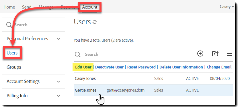 Välj användarposten du vill redigera för att visa de tillgängliga användaråtgärderna.