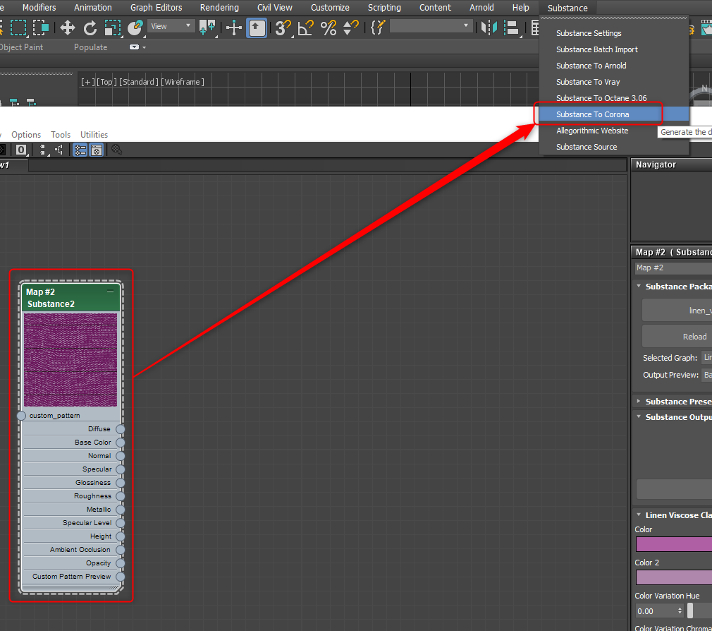 Using the 3ds Max plugin, you can choose Corona in the Substance menu to automatically setup the Corona material with Substance texture inputs.