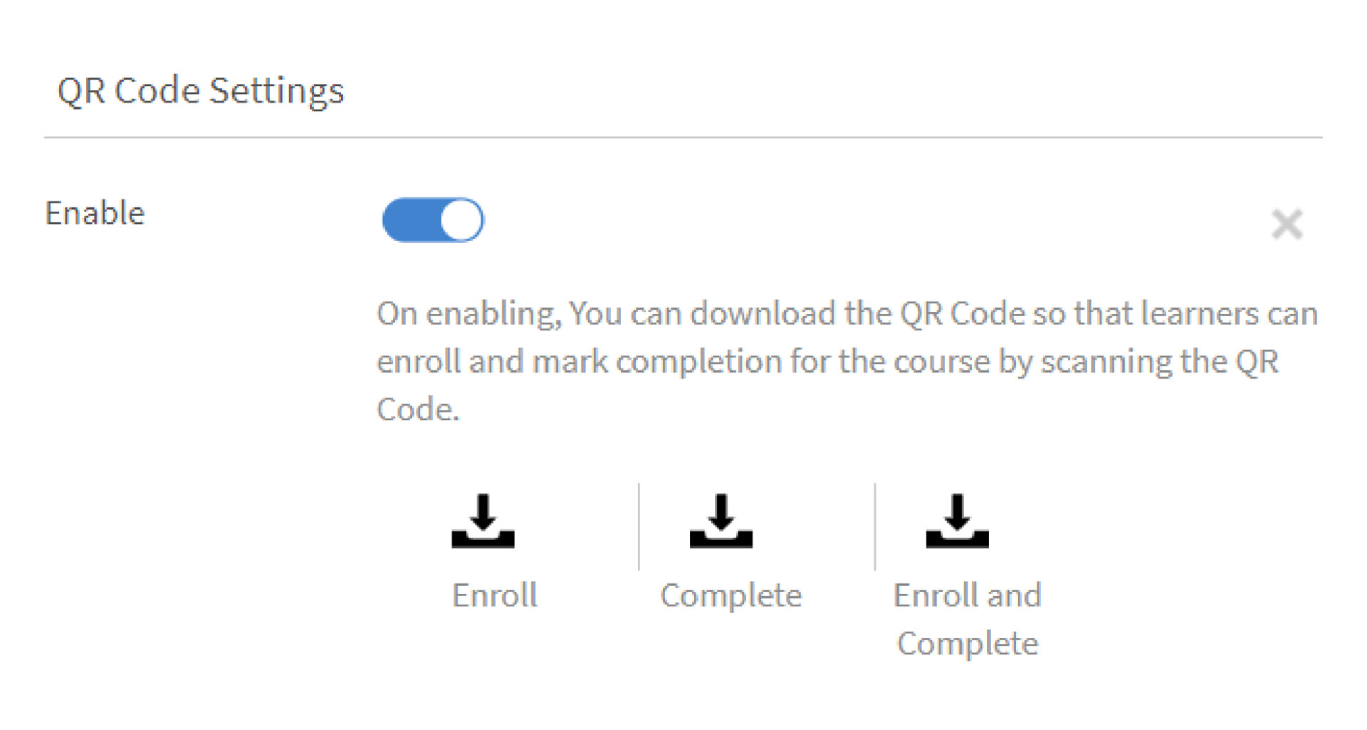 Adobe Learning Manager provides QR codes for courses. The administrator can print the QR codes to help learners quickly enroll into a course. Similarly, QR codes are available to mark enrollment, completion, and both.