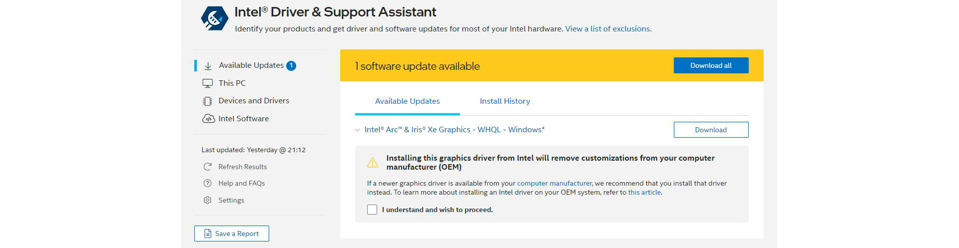 The Intel® Driver & Support Assistant will monitor and update more than just your GPU drivers. You may regularly view updates to Wifi, Bluetooth, and Chipset drivers, as well. The tool allows you to select which drivers you wish to download and install.